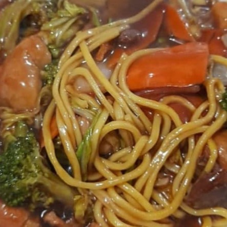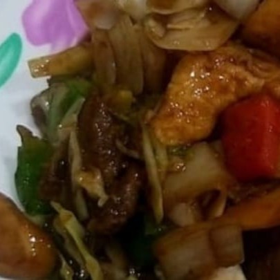 Macarrão frito, pedaços de frango e fatis de carne, legumes e temperado ao molho de soja e shoyu.