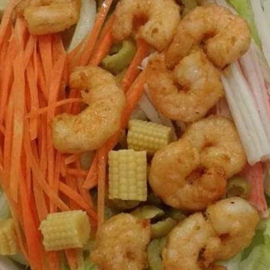 Alface Americano,kani cama, cenoura e azeitona Opçoes . Camarão ou Frango frito. Acompanha molho especial