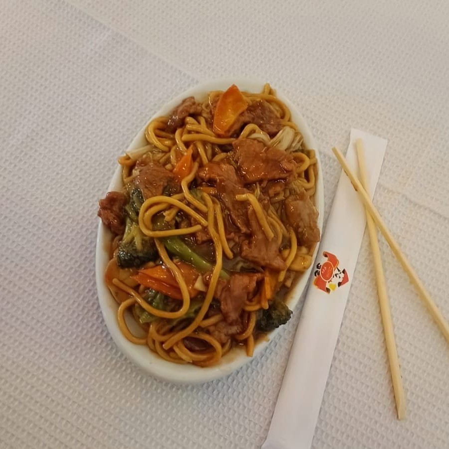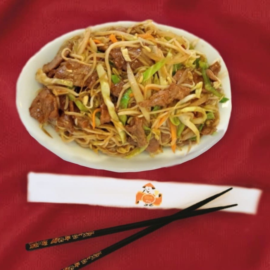 Macarrão de arroz, flocos de ovos, carne (suína ou bovina) em tiras, broto de feijão, pimentão, cenoura, champignon e cebola