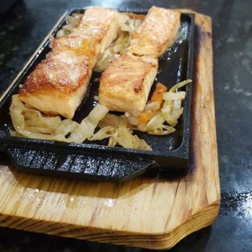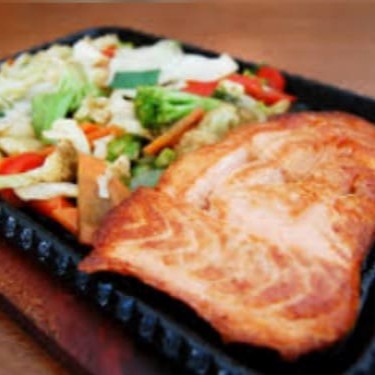 Yakimeshi, batata frita, salada especial, 200g de salmão com legumes grelhado