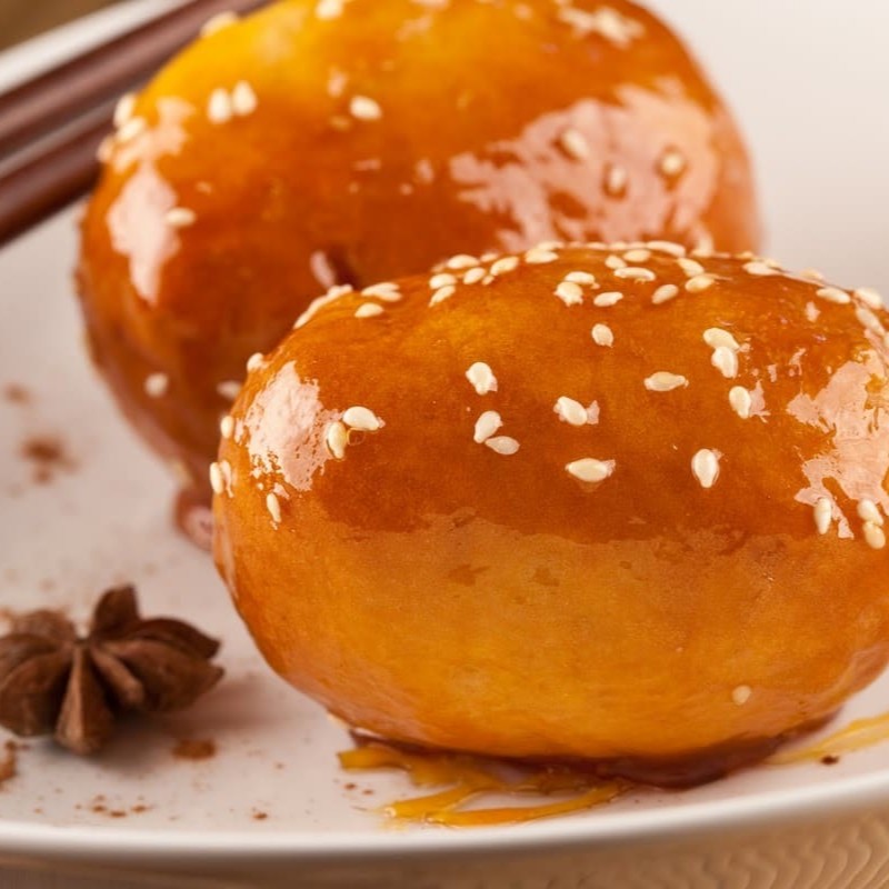 Banana empanada e caramelada, salpicada com semente de gergelim.