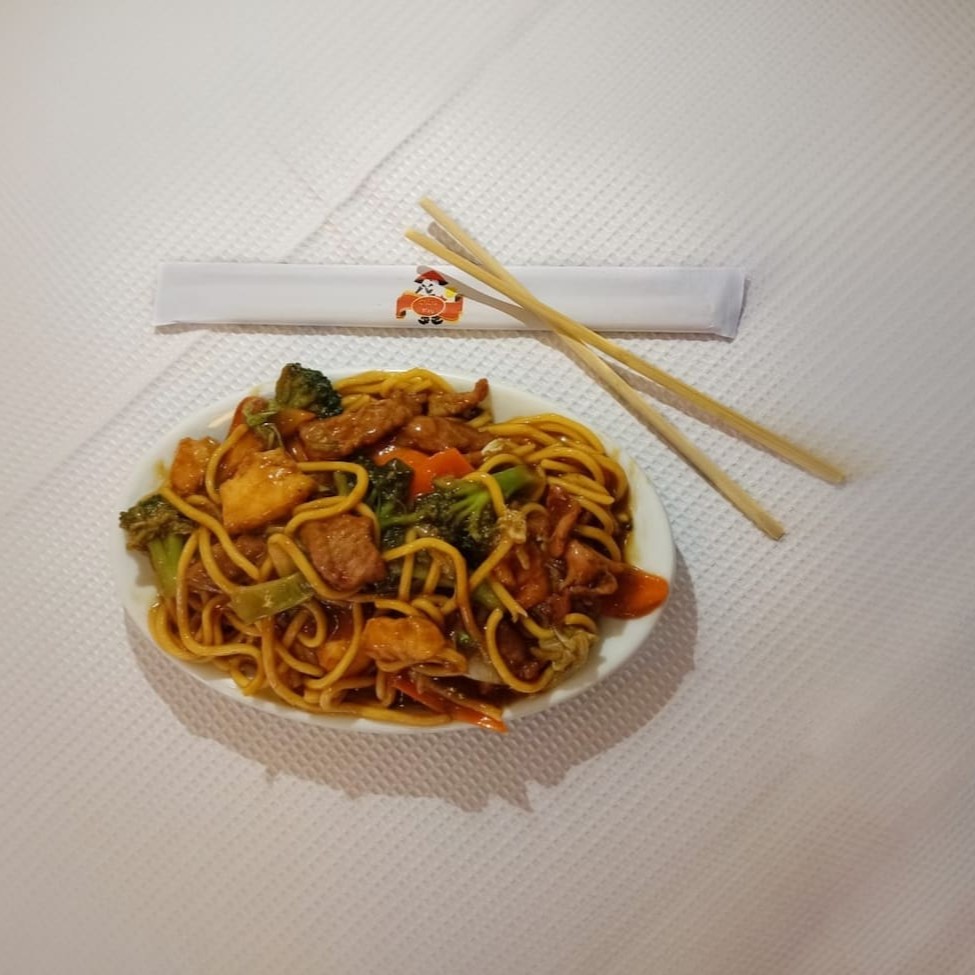 Macarrão, frango, camarão, presunto e broto de feijão temperados com alho e gengibre