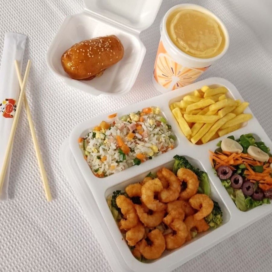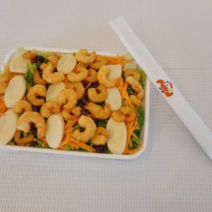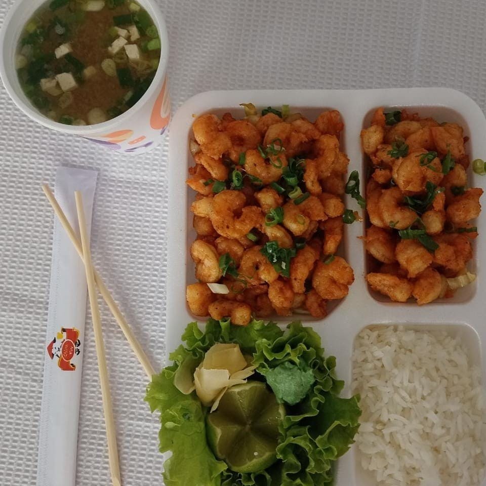 Yakimeshi,batata frita,salada especial, 150g camarão com legumes grelhado