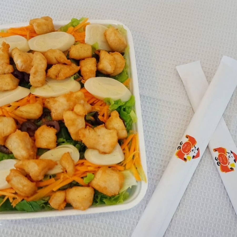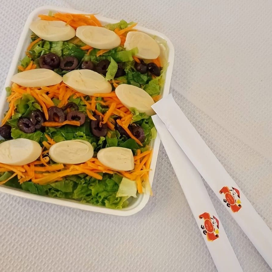 Alface, frango, rúcula, cenoura desfiada,palmito e azeitonas pretas (acompanha molho especial)