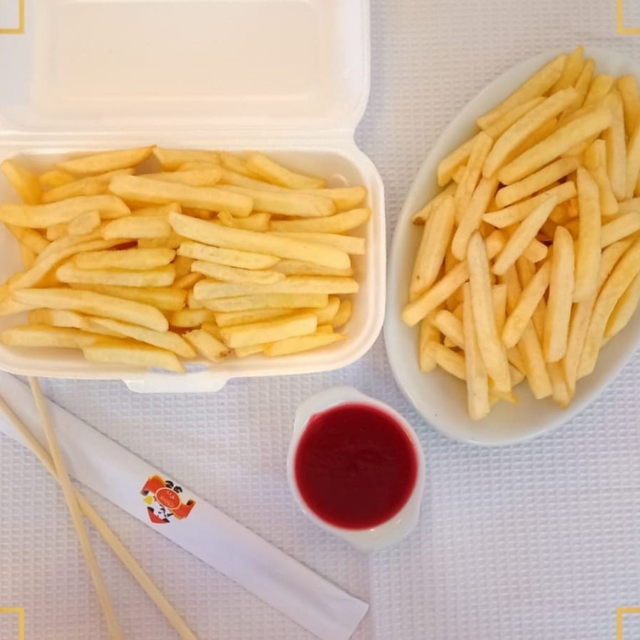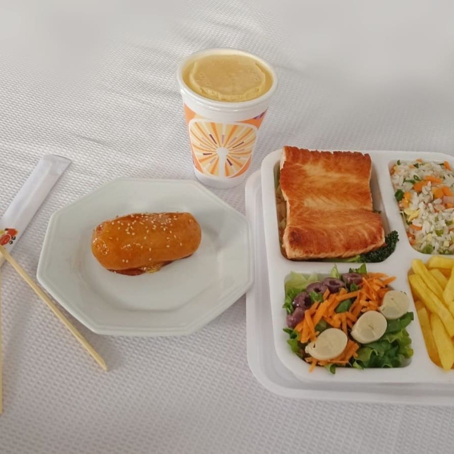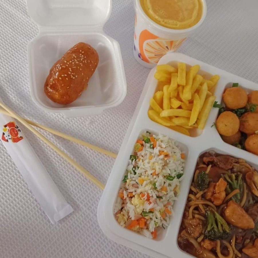 Arroz primavera, frango empanado, batata frita ou salada especial (alface americana, rúcula, cenoura, azeitonas e molho especial), acompanha suco de laranja 400ml ou 1 unidade de banana caramelada