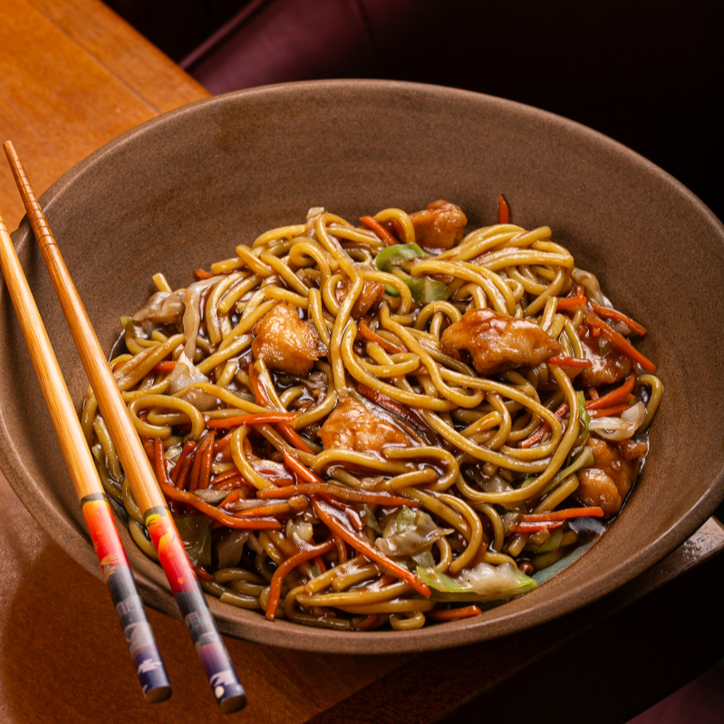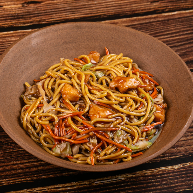 Macarrão com filé de peito em cubos com repolho e cenoura desfiados ao molho a base de shoyu