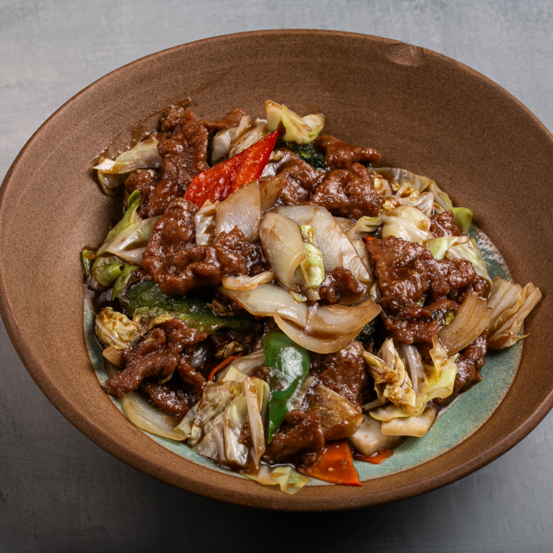 Delicioso macarrão chinês frito, acompanhado de carne bovina, acelga, brócolis e cenoura