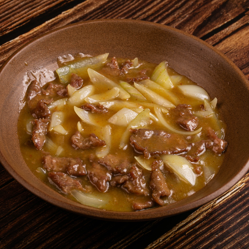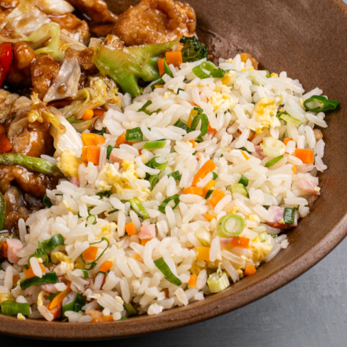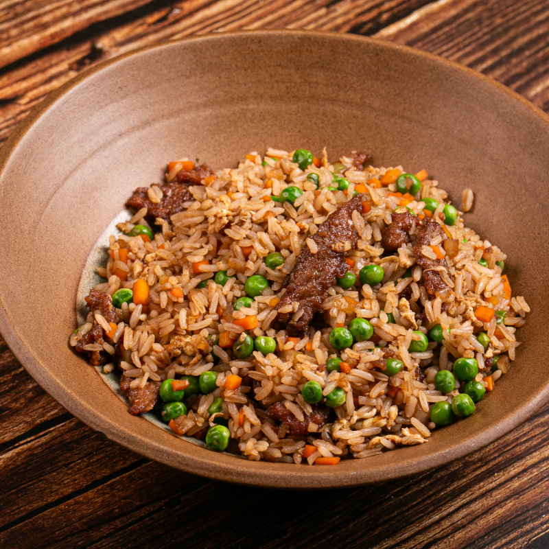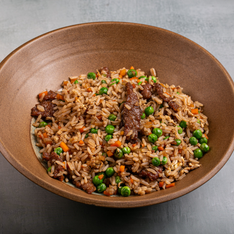 Arroz, carne desfiada, ovos, ervilha, cebola e cenoura temperado ao molho de soja
