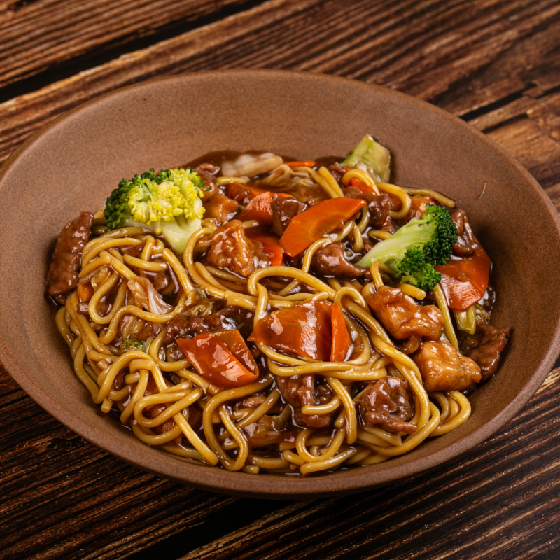 Delicioso macarrão chinês frito, acompanhado de carne bovina, frango, acelga, brócolis e cenoura