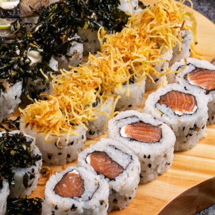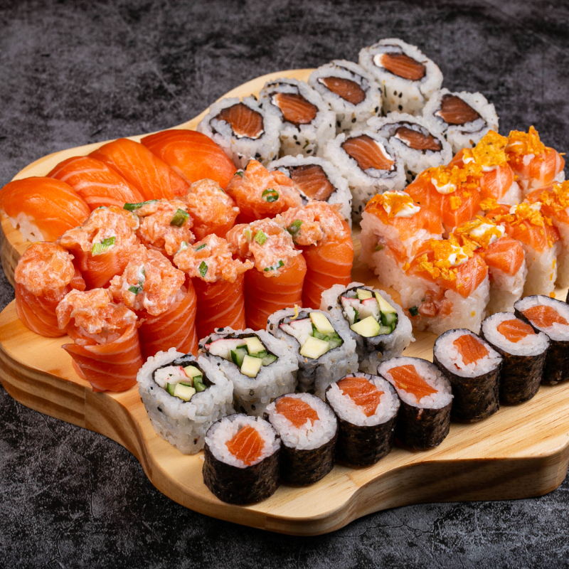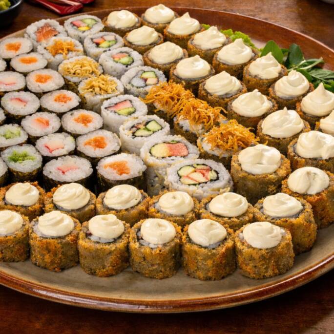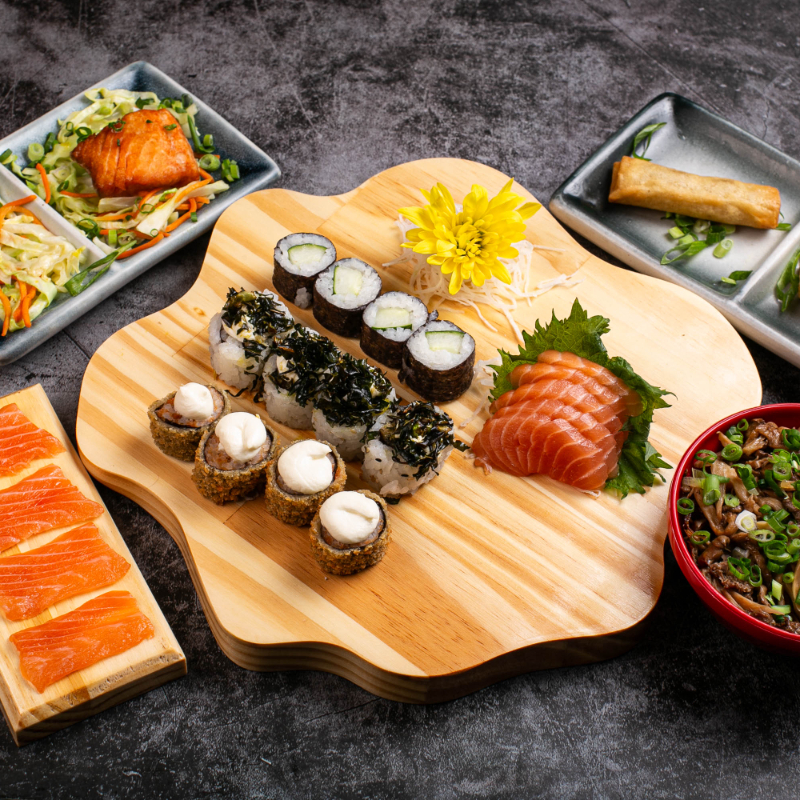 20 peças de enrolados com arroz, alga, gergelim e recheio: 6 skin, 8 salmão e 6 califórnia; Não é permitido fazer nenhuma alteração/troca nos itens deste prato.