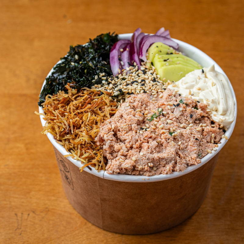Arroz (de sushi) coberto com salmão grelhado e desfiado misturado com cream cheese, cebolinha e molho tarê, sunomono, couve crispy, amendoim, crispy de bifum e gergelim