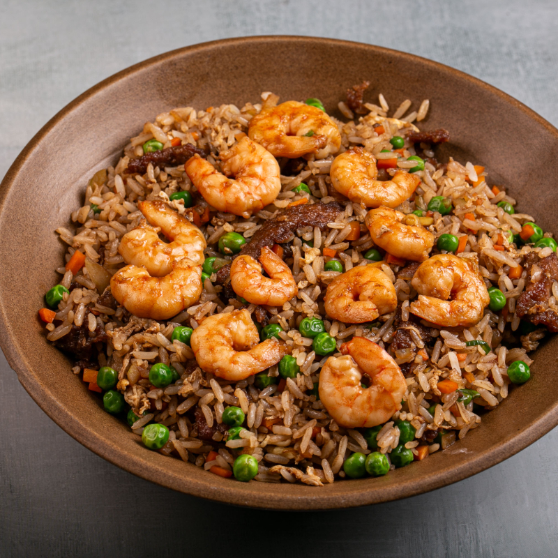 Risoto chinês, carne desfiada, ovos, ervilha, cebola e cenoura ecamarão temperado ao molho de soja