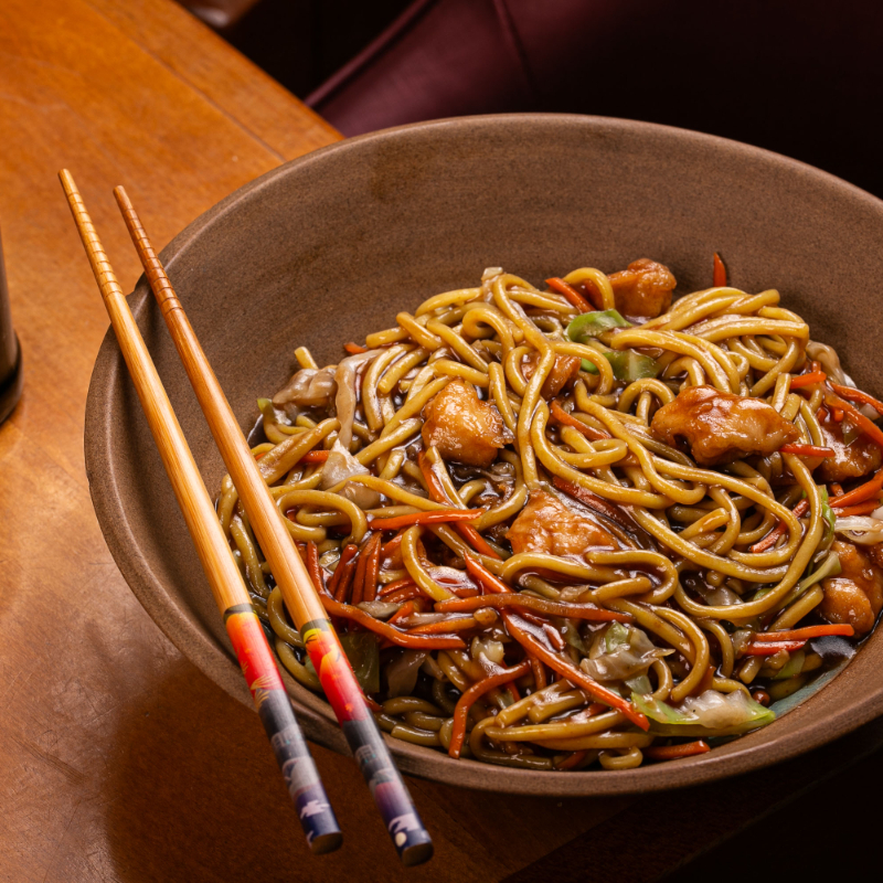 Delicioso macarrão chinês frito, acompanhado de frango, acelga, brócolis e cenoura