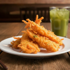 Cenoura,cebola,repolho,vagem,brócolis e desfiados empanados.com camarão em uma massa leve e crocante