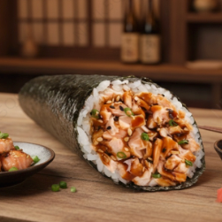 Temaki de salmão grelhado empanado na farinha panco e frito, acompanha creme cheese cebolinha e molho tarê
