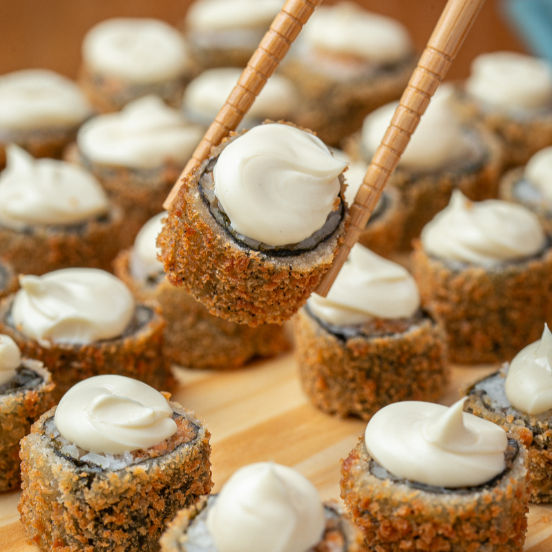 20 peças: enrolado frito com arroz e recheio de peixe coberto com cream cheese e molho tarê.