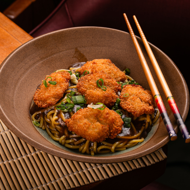 Macarrão com molho a base de shoyu,com pedaços de frango crispy e cebolinha picada