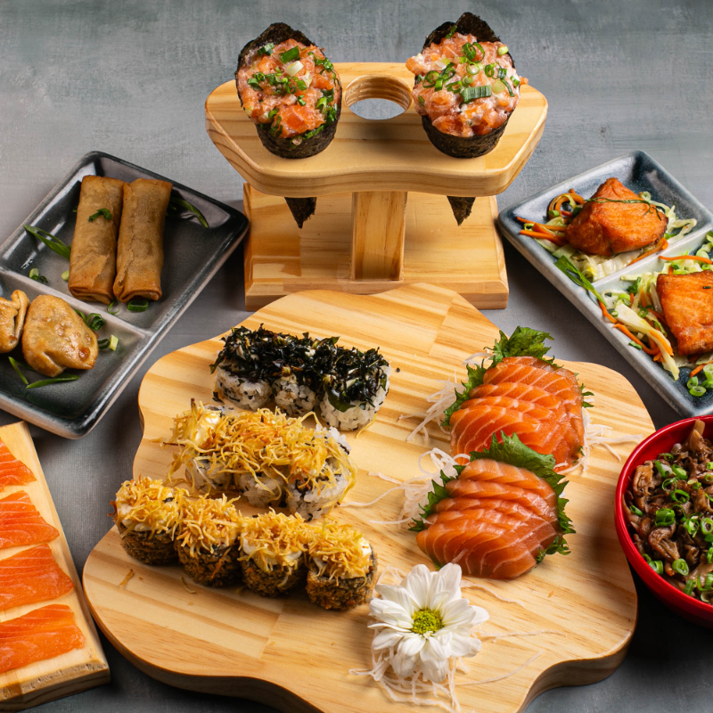 Esse é meu Combo preferido. Suuper variado e da para dividir tranquilamente com o mozão. São 60 peças de pura delícia: 10 Hot Rolls 10 Sashimis (5 salmão, 5 saint peter) 10 Hossomakis (5 salmão, 5 kani) 10 Uramakis (5 salmão, 5 califórnia) 10 Niguiris (5 salmão, 5 skin) 2 Sushi Jhou 8 Ichigô (sushi doce) Leia aqui também hein: Como é promoção não pode trocar, tá? Esse pedido acompanha 1 hashi,