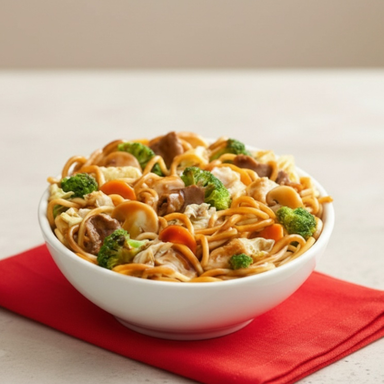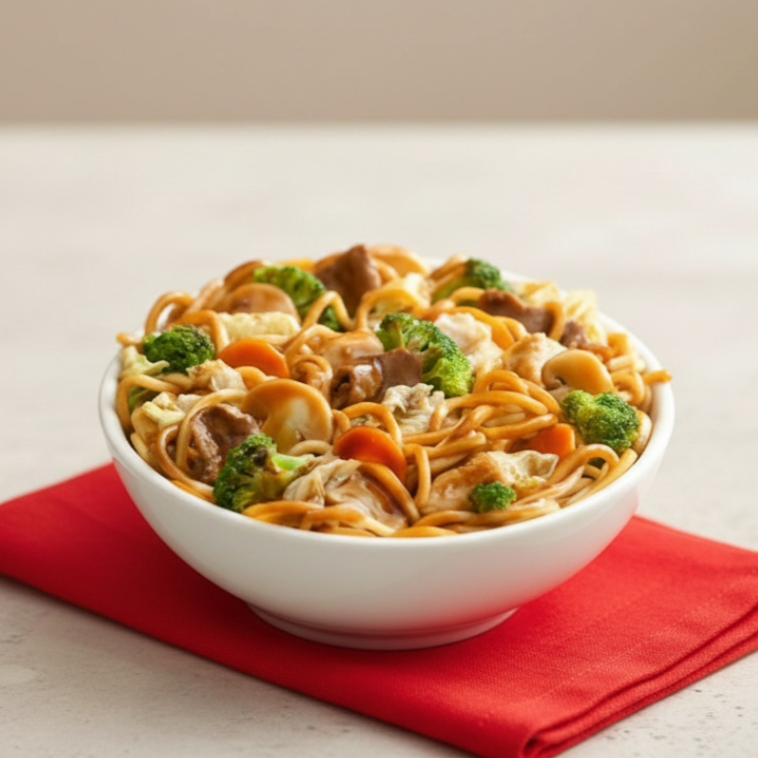 Macarrão de yakissoba, Carne e Frango Legumes, Acelga, brócolis, Couve Flor, Cenoura, Molho da casa