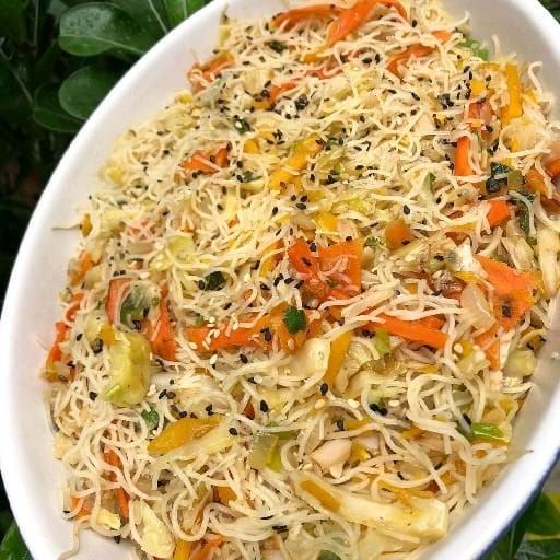 Macarrão frito ,carne bovina,repolho,couve-flor,brócolis e cenoura.