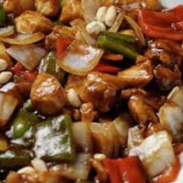 Cubinhos de frango,pimentão,cebola e amendoim. Porção individual metade com arroz yakimeshi.