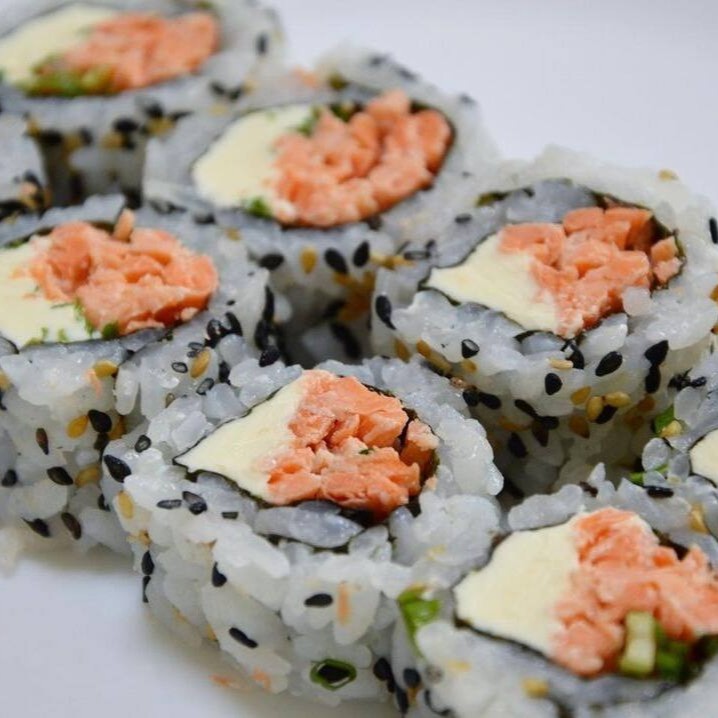 Salmão enrolado na alga com arroz cream cheese e cebolinha.