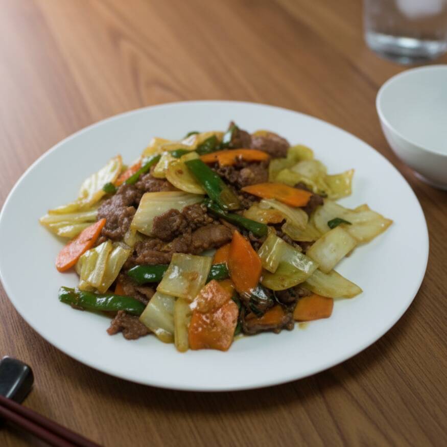 Carne fatiada, repolho, cenoura, pimentão e acelga