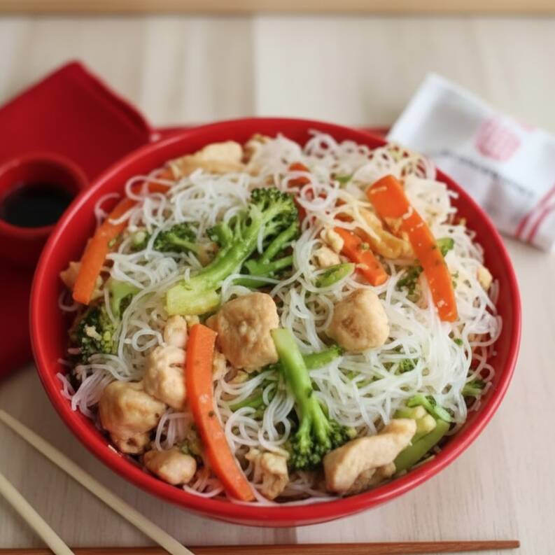 Bifum (macarrão de arroz), carne, frango, brócolis, couve-or, cenoura e repolho.