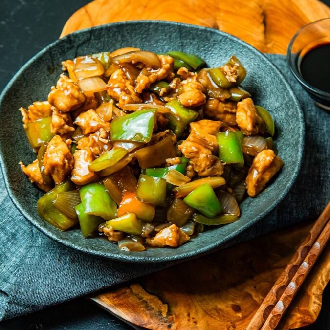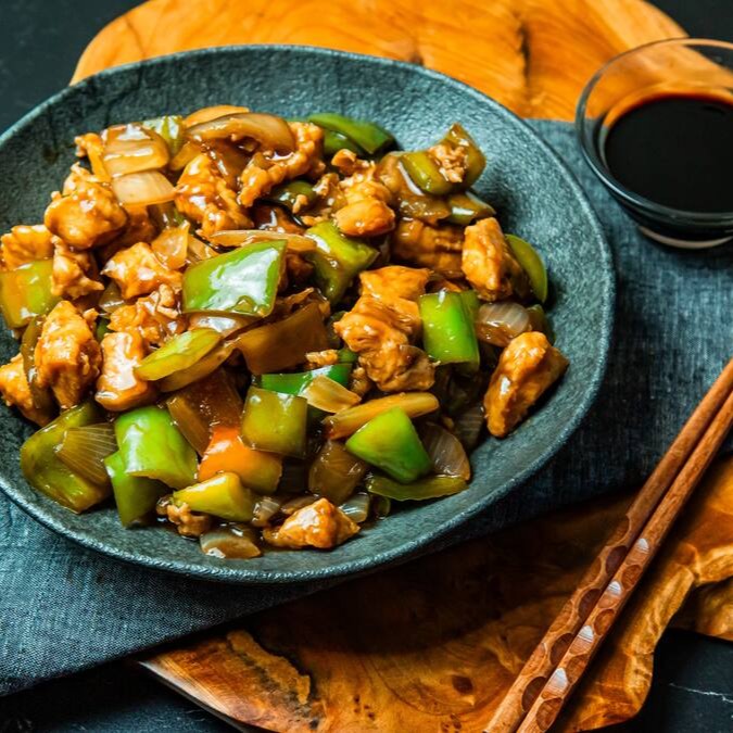 Generosos cubos de peito de frango, servidos com cebola, pimentão e amendoim. Ao molho especial Chinês. Temos opções que servem até 4 pessoas.