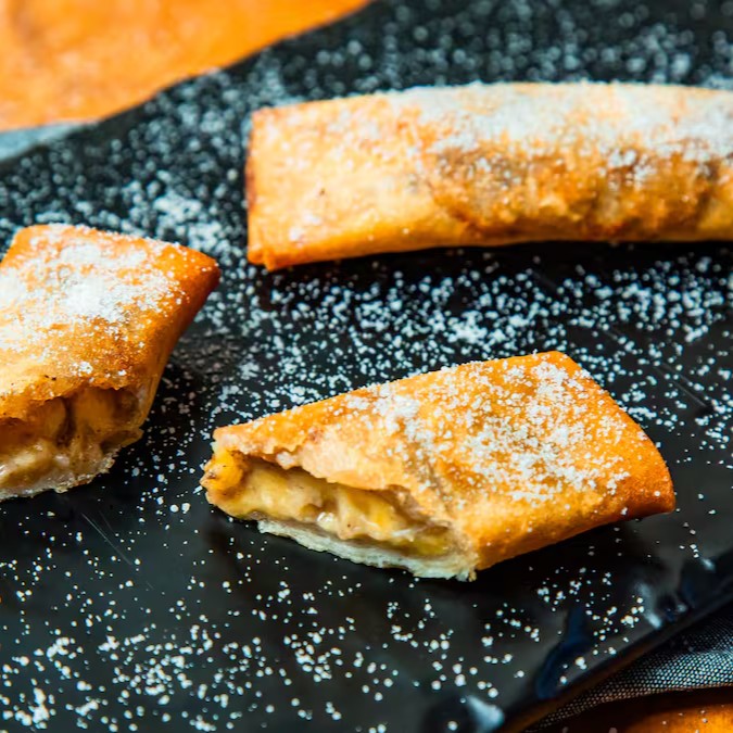 Massa crocante recheada com banana, canela e açúcar gourmet.