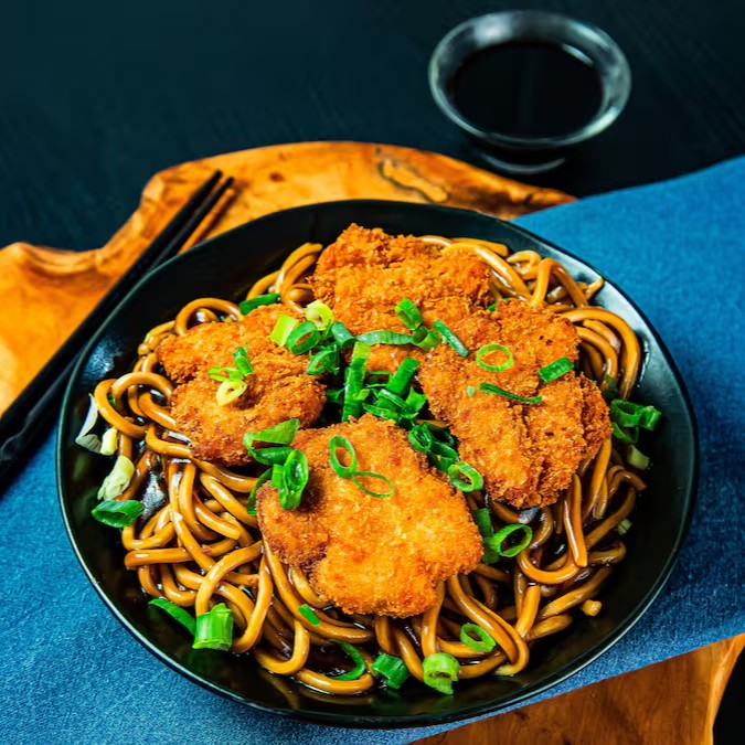 Filé de frango empanado com farinha crocante acompanhado do nosso delicioso macarrão chinês ao molho especial.