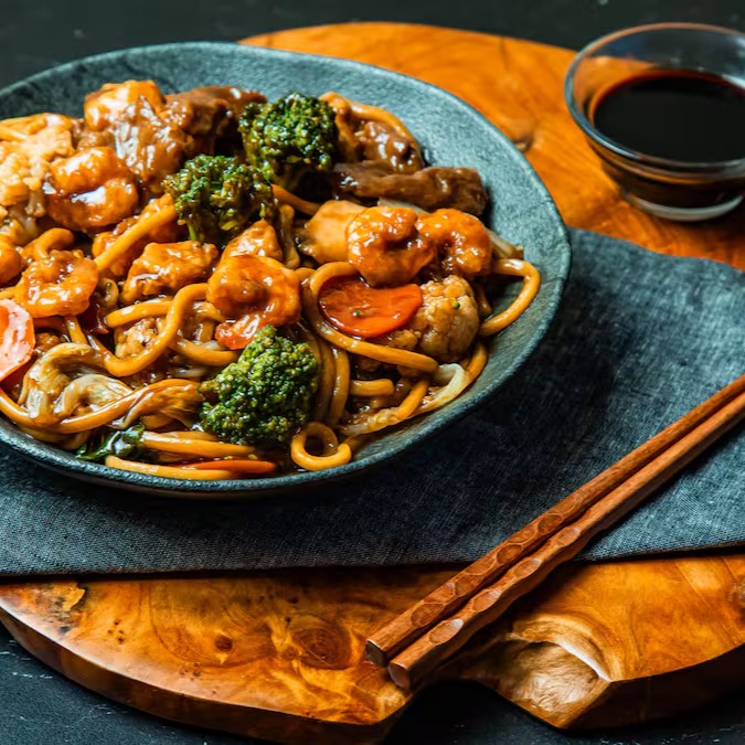 A mistura perfeita do nosso clássico yakissoba de carne, frango e camarão com legumes frescos e champignos, ao molho especial Chinês. Temos opções que servem até 4 pessoas.
