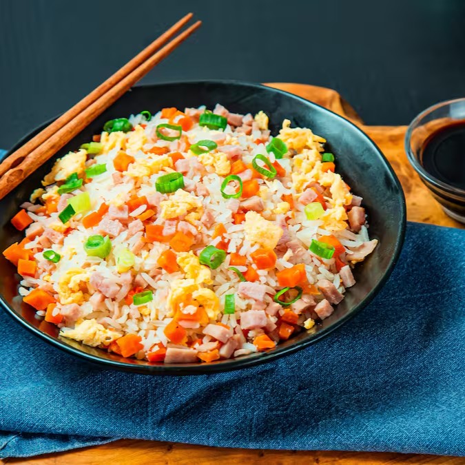 Arroz chinês com apresuntado, ovo, cenoura e cebolinha