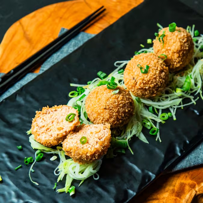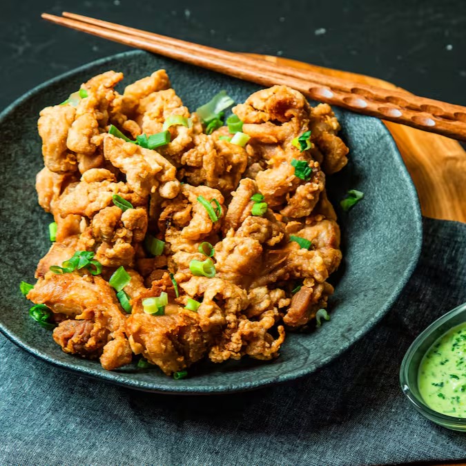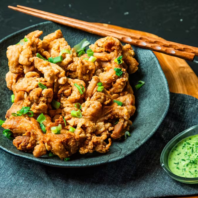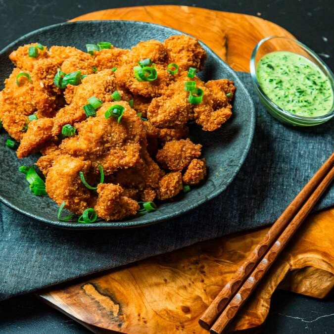 Filés de sobrecoxa, empanados com massa crocante. Acompanha Arroz Yakimeshi e molho verde a base de salsa e cebola.