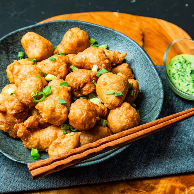 Generosos cubos de filé de frango empanado em massa leve, fritos e salpicado com alho e cebolinha. Acompanha molho a base de salsa e cebola. Temos opções que servem até 4 pessoas.