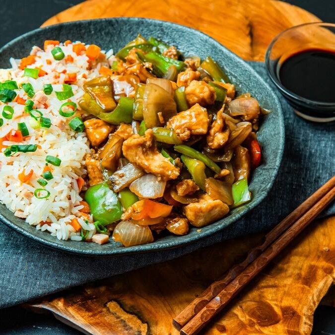 Generosos cubos de peito de frango, servidos com cebola, pimentão e amendoim. Ao molho especial Catay. Acompanha Arroz Yakimeshi.