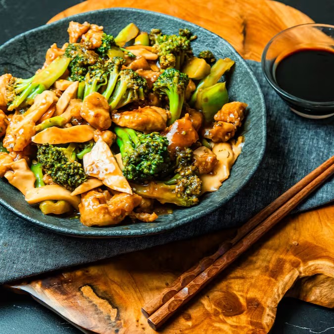 Generosos cubos de peito de frango com brócolis, pimentões e cogumelos ao molho especial Chinês. Temos opções que servem até 4 pessoas.
