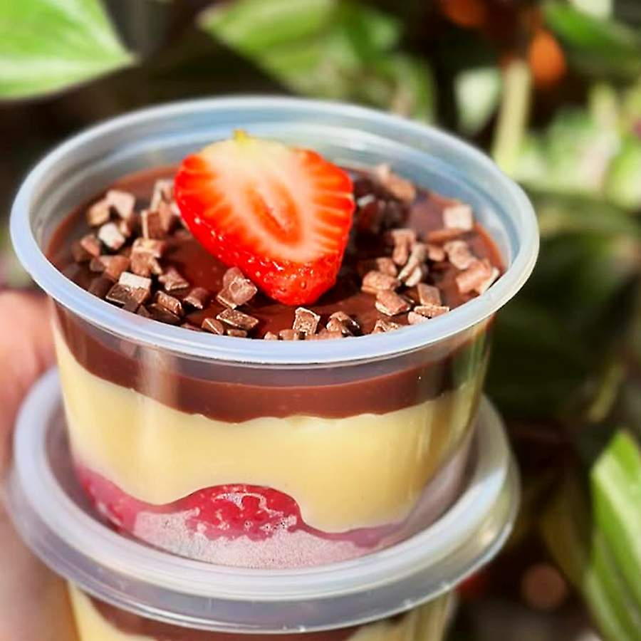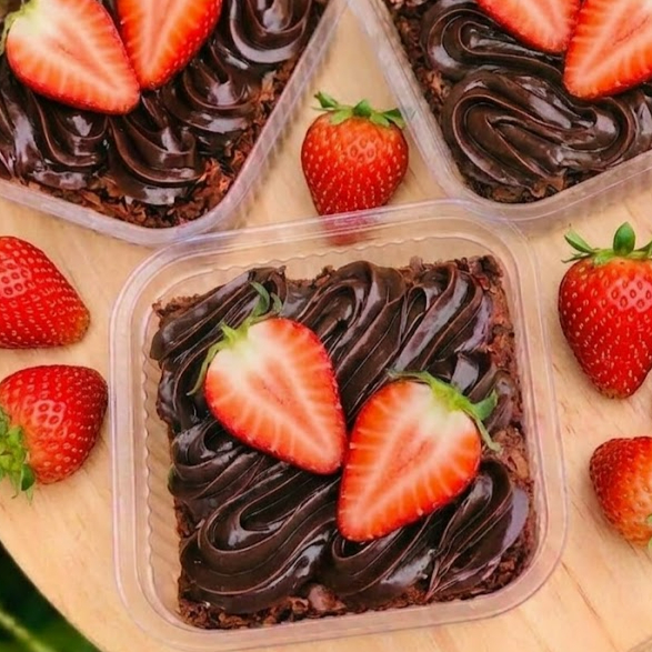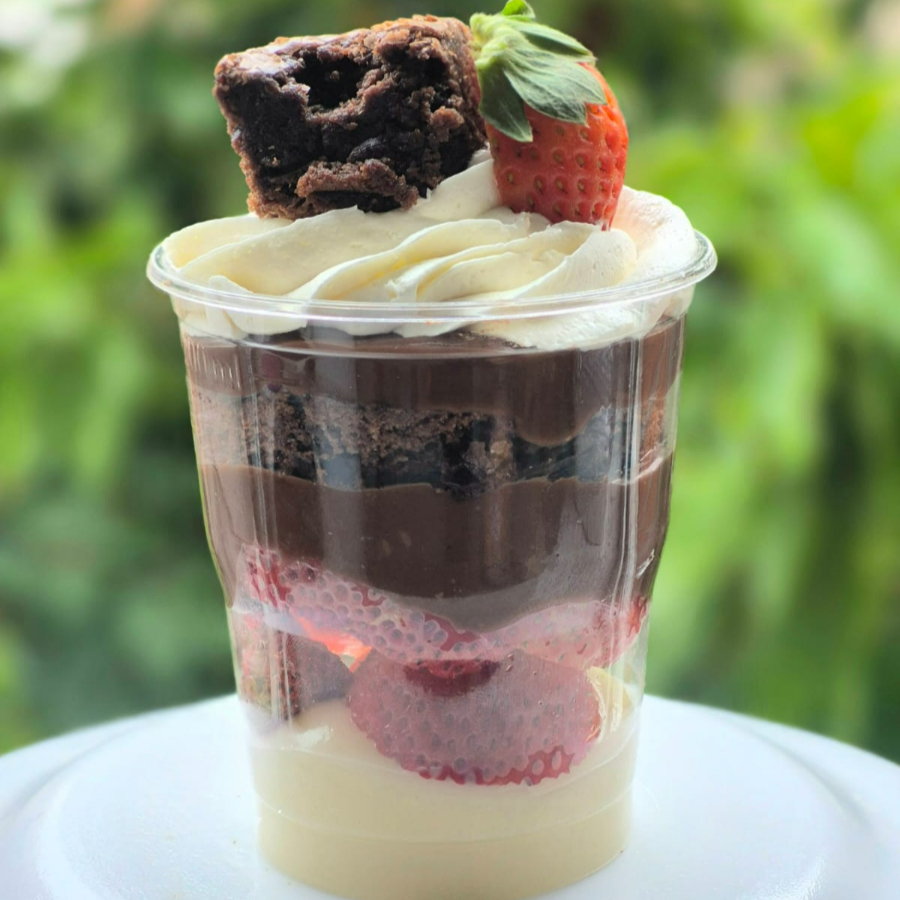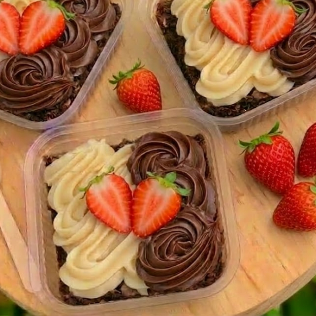 Delicioso Brownie de chocolate, Morangos frescos, Uvas verdes sem sementes, um delicioso creme de leite ninho e brigadeiro tradicional.