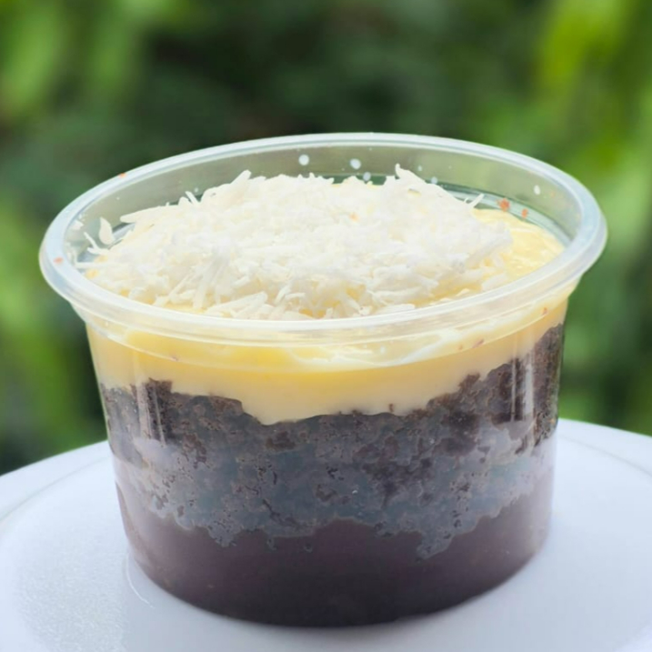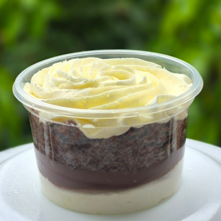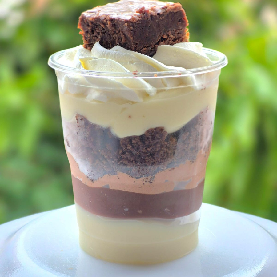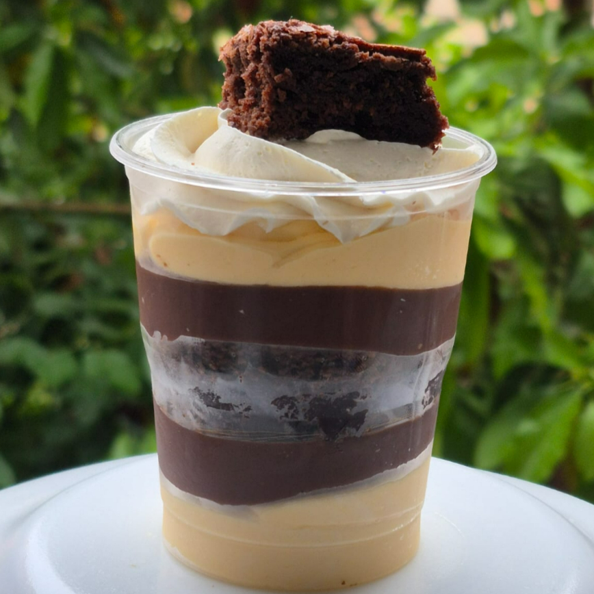 Um delicioso brownie de chocolate com de 2 camadas de mousse de maracujá, 2 camadas de brigadeiro tradicional e mousse de ninho.