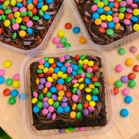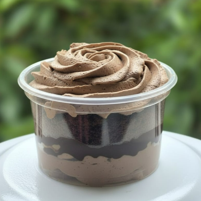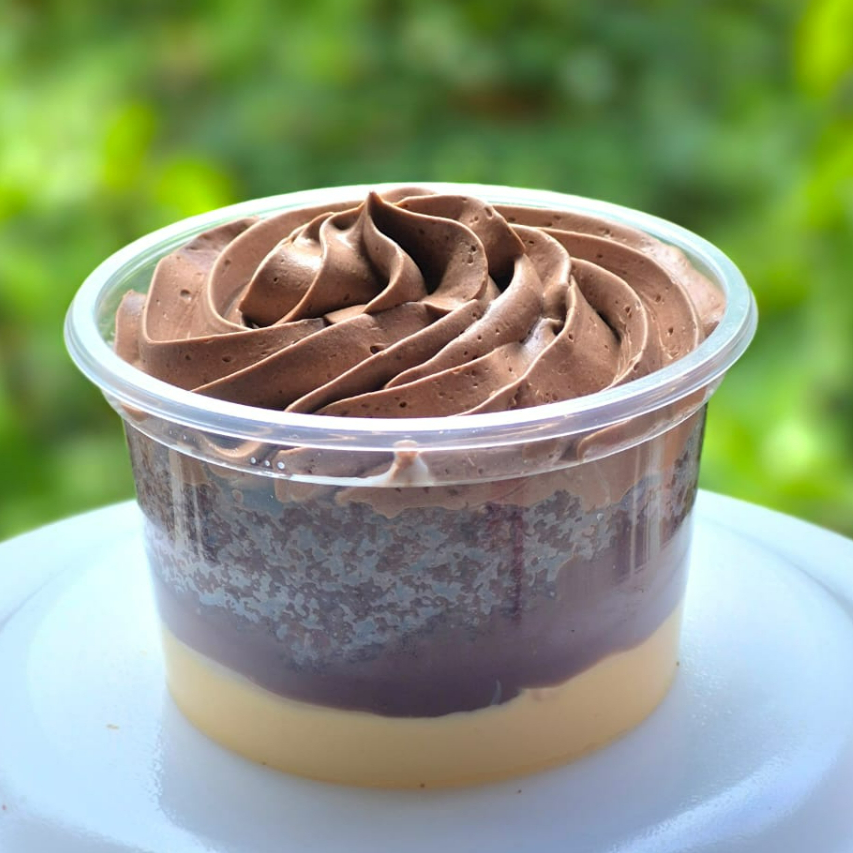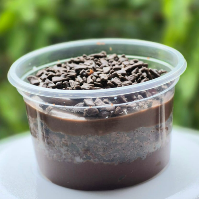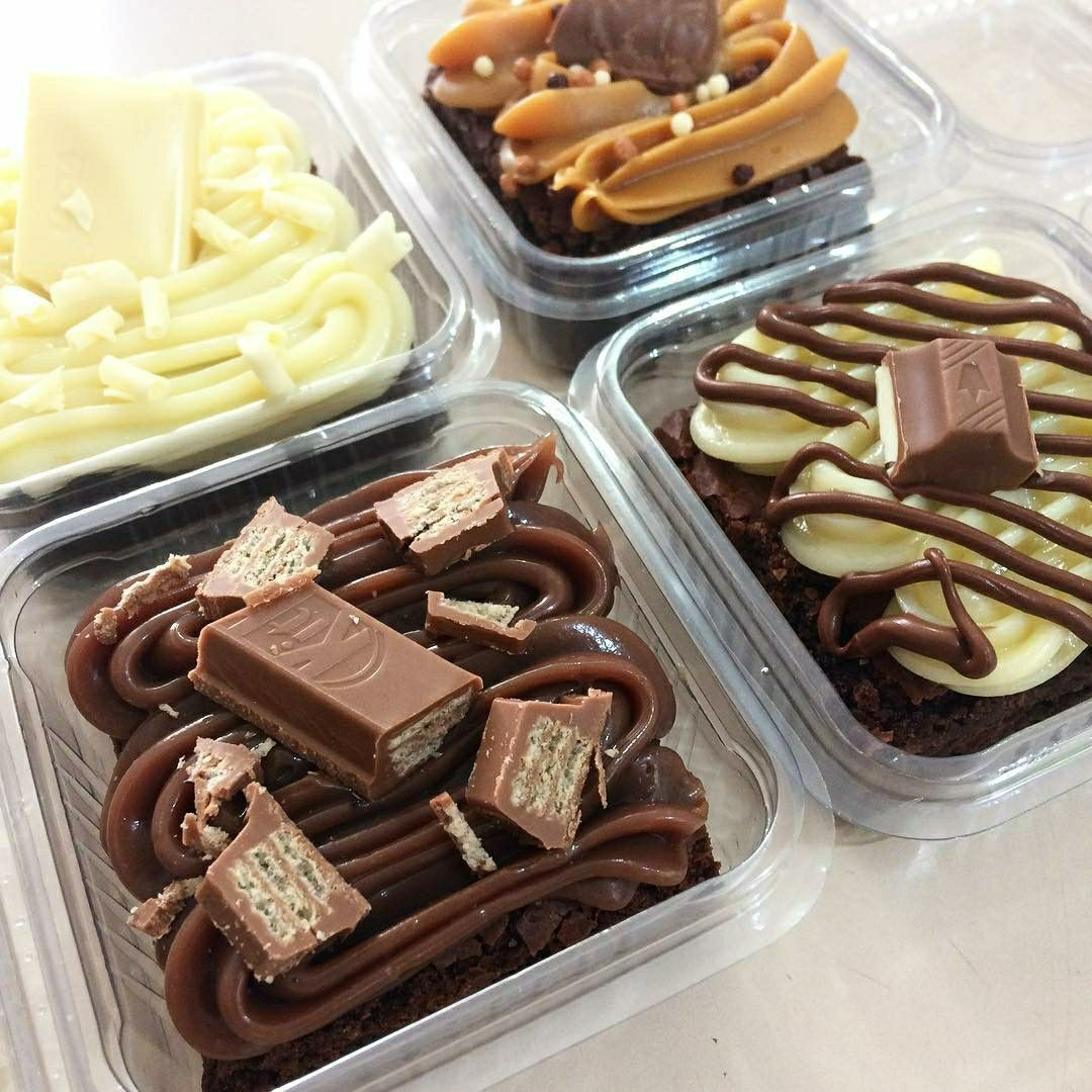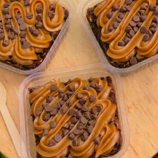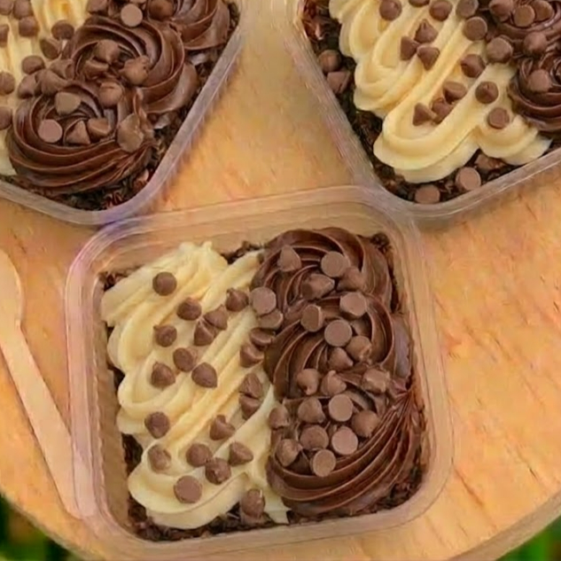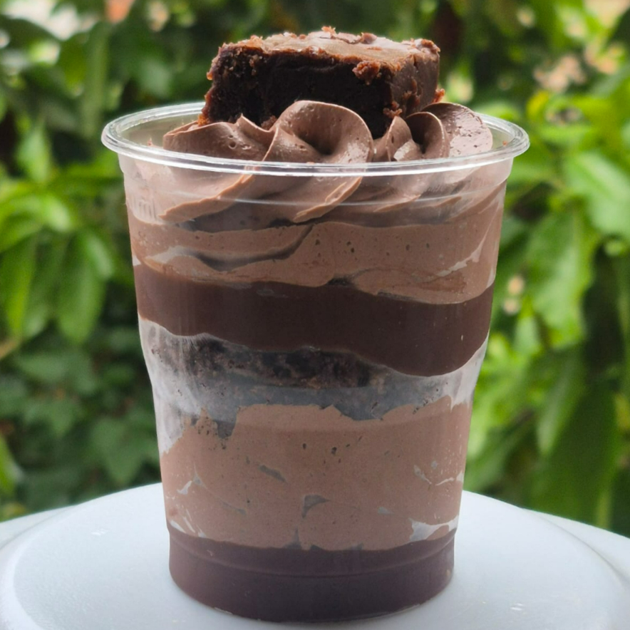 Um delicioso brownie de chocolate com 2 camadas de brigadeiro, 2 camadas de mousse de chocolate.