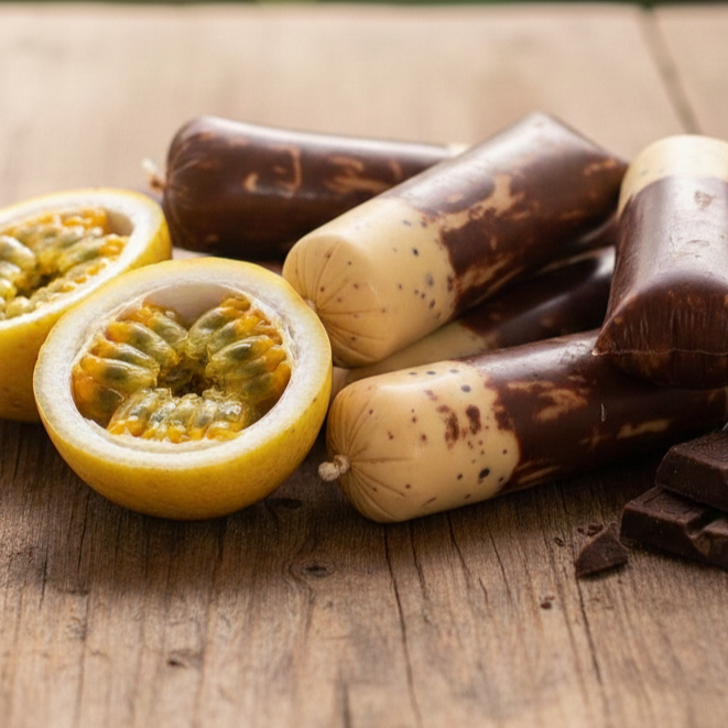 O equilíbrio perfeito que você procurava! Unimos a cremosidade vibrante do maracujá com chocolate meio amargo. Uma experiência sensorial onde a acidez da fruta encontra a intensidade do cacau.