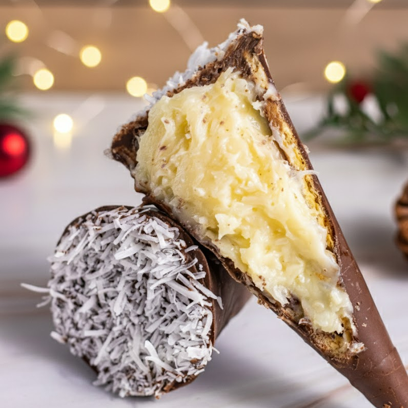 Uma deliciosa casquinha coberta com chocolate e recheada com beijinho cremoso.
