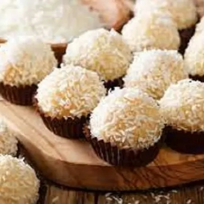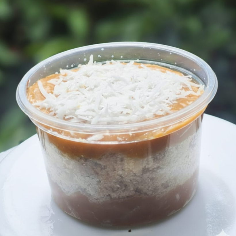 Uma camada de brigadeiro, uma camada de bolo de chocolate, mais uma camada de beijinho, finalizado com coco seco.