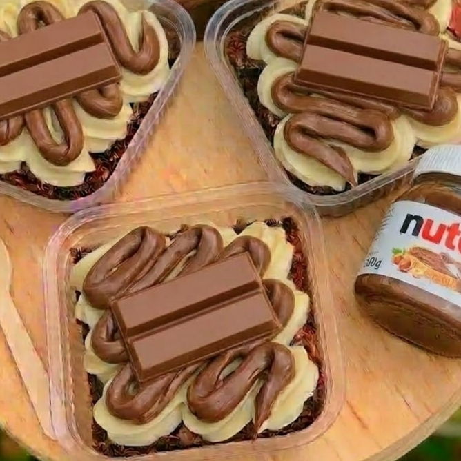Um delicioso brownie de chocolate com 2 camadas de brigadeiro de ninho, brigadeiro tradicional, mousse de chocolate e mousse de ninho