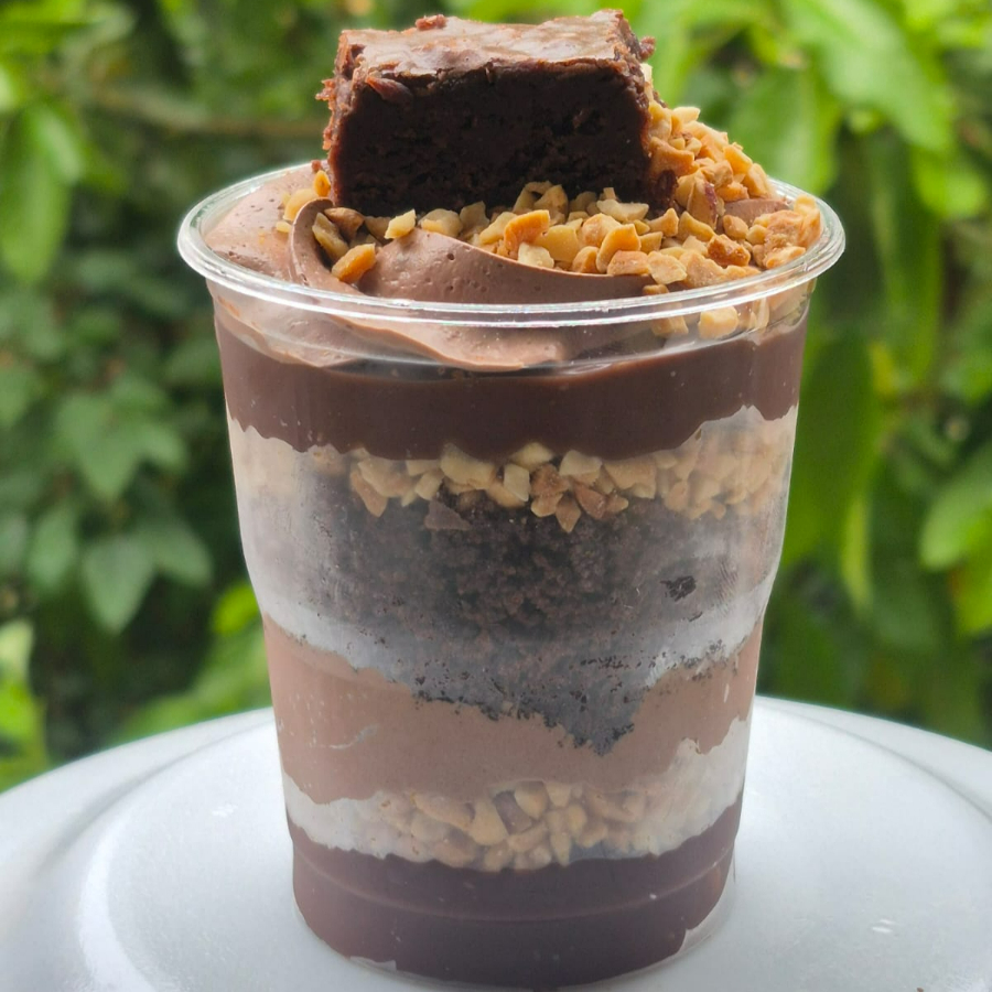 Um delicioso brownie de chocolate com brigadeiro tradicional, amendoim e mousse de chocolate. #copodafelicidade