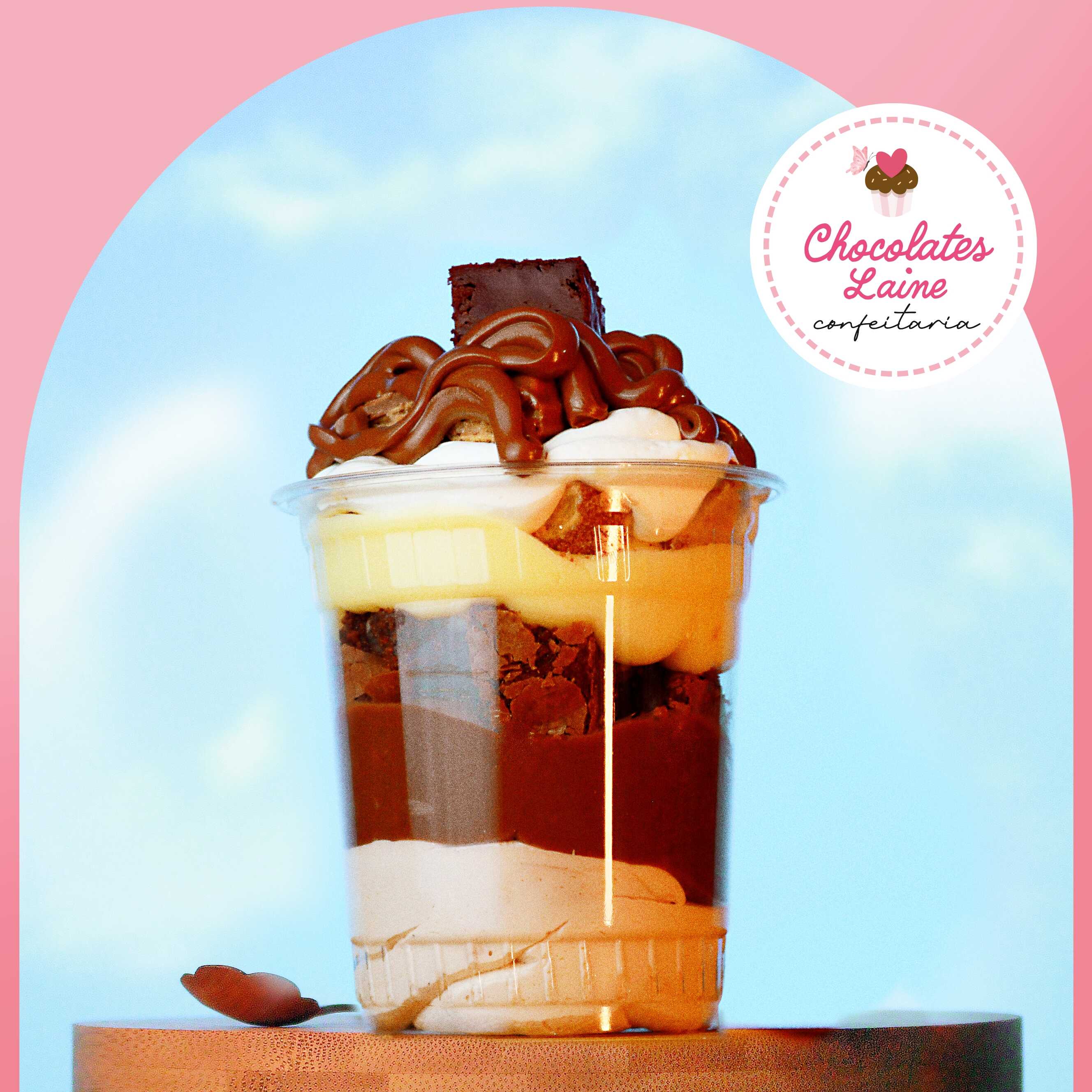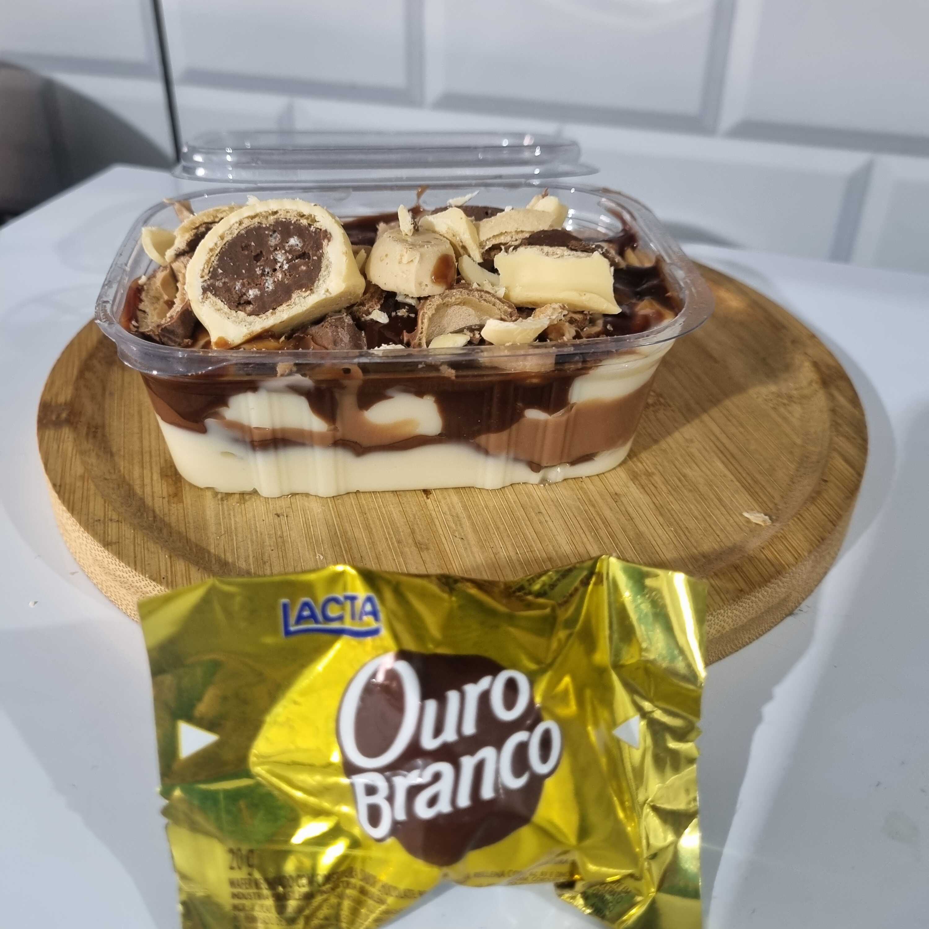 Delicie-se com nosso Copo da Felicidade de Ouro Branco, que combina mousse de Ninho, mousse de chocolate, creme de chocolate branco, creme de chocolate ao leite e bombons de Ouro Branco. Uma sobremesa luxuosa e irresistível, perfeita para momentos especiais.