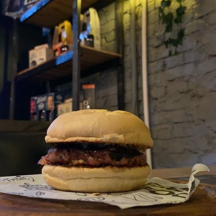 150g de Burguer artesanal de fraldinha com bacon em tiras, picles, molho picante, queijo prato e cebola roxa no pão de brioche.