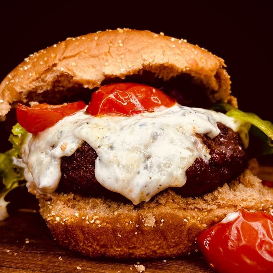 150g de Burguer artesanal de fraldinha com molho especial de gorgonzola e rúcula tomate cereja no pão australiano