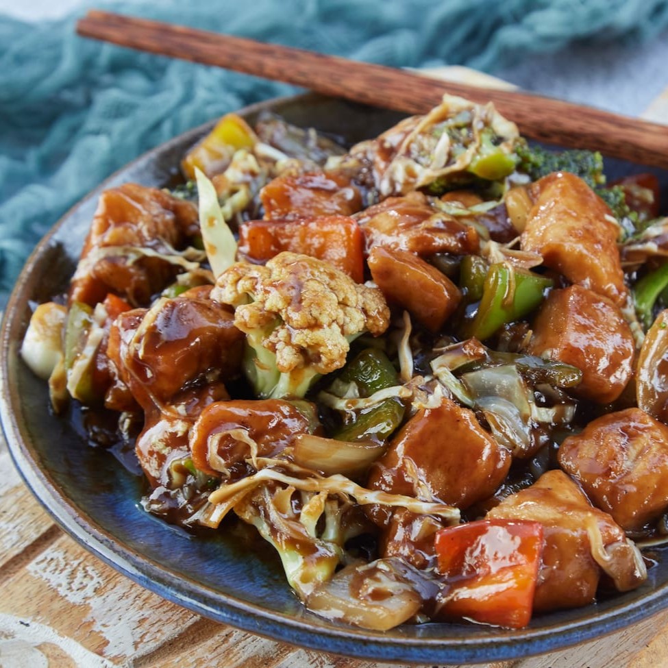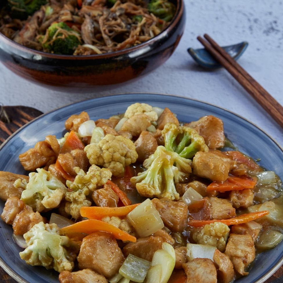 Cubos de filé de frango salteados no Wok, com temperatura de 400ªc com legumes selecionados: couve-flor, brócolis, cebola, pimentões coloridos vermelho, amarelo, verde, broto de feijão e repolho, a porção executiva acompanha 1/2 porção de yakimeshi ( arroz com legumes, flocos de ovos e presunto ).