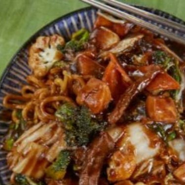 Delicioso macarrão chun-li, frito, tiras de carne bovina e cubos de filé de frango, legumes selecionados: brócolis, couve flor, cenoura e acelga, salteadas no molho chun-li a base de shoyu.